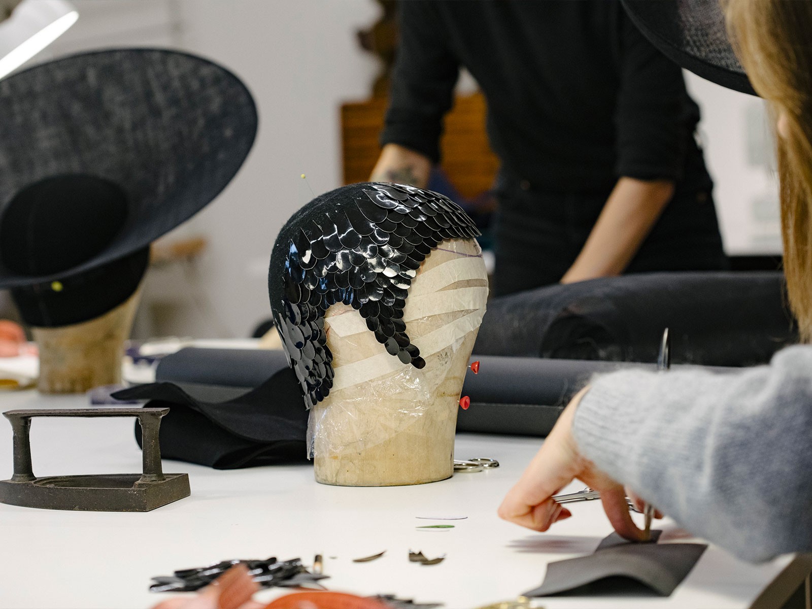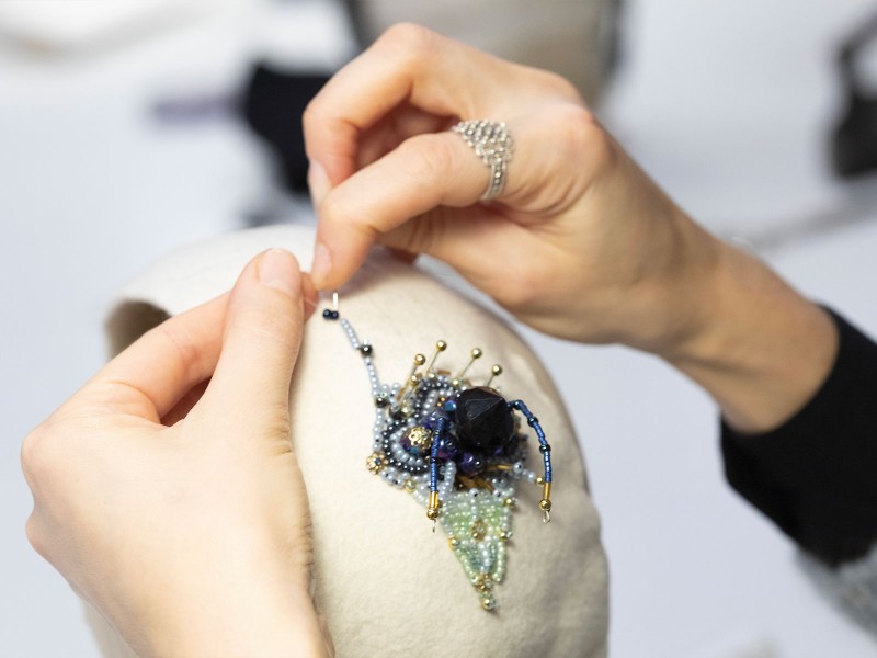 Work is underway on a dual project at Ilariusss. There are collaborations with the most prestigious international fashion brands, from Versace to Vuitton, from Valentino to Max Mara: hats, headbands, and headpieces created to match the outfits they will accompany and in line with the event where they will be worn—whether a runway show or a red carpet, the Met Gala, a royal wedding, or a state funeral.