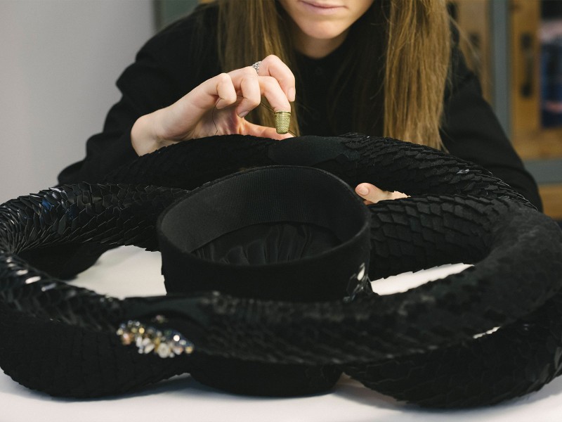 Then there is the line in which Ilaria Soncini expresses herself fully and channels all the passion that took her from Emilia to study in Milan, to establish herself in Berlin, and then return to open her atelier in Lambrate. This is how sculptural headpieces like Endless are born—two entwined snakes shining as they dance around the head; hats for the theater; or the wide-brimmed cut hats that have become somewhat her signature; and the mask that a young Indian woman commissioned to celebrate her graduation, which required ten days of collaborative work between Ilaria, Gemma, Floriana, and Anaïs. One creates, another sews; someone cuts, someone else embroiders. Everything, from the first to the last stitch, is handmade.