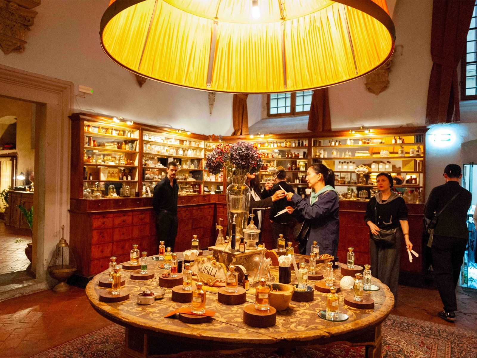 The door of Palazzo Rosselli Cecconi, in the heart of Borgo Santa Croce, opens into a cobbled courtyard and from there, a steep staircase leads to the ancient underground cellars that are now the laboratories of the Aquaflor artisan perfumery. Under the vaulted ceilings, the counters are filled with colored flasks, which look like an alchemist's workshop. There’s the flower room, full of dried flowers of all kinds. And there’s the nose room, where, by mixing different essences, you can create your own perfume.