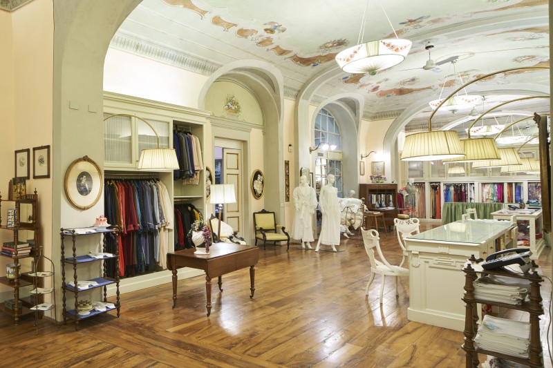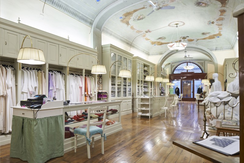 The workshop the brand will open to the public (850 square meters in the old heart of Florence, in Via delle Belle Donne) is where the high fashion lingerie chosen by the Duchess of Kent, Paola del Belgio, Jane Fonda, emirs, rock stars attracted by the 19th century art of embroidery applied to unique and precious garments is created. An enchanting panorama of household linen and silks used by royal families from all over the world (Windsor, Orange-Nassau, Bourbon) and by the Rockefellers, by the Roshschilds, by the Kennedys, by the Gettys. In that same atelier, there’s a private collection of thousands of pieces ranging from 1500 to 1960.