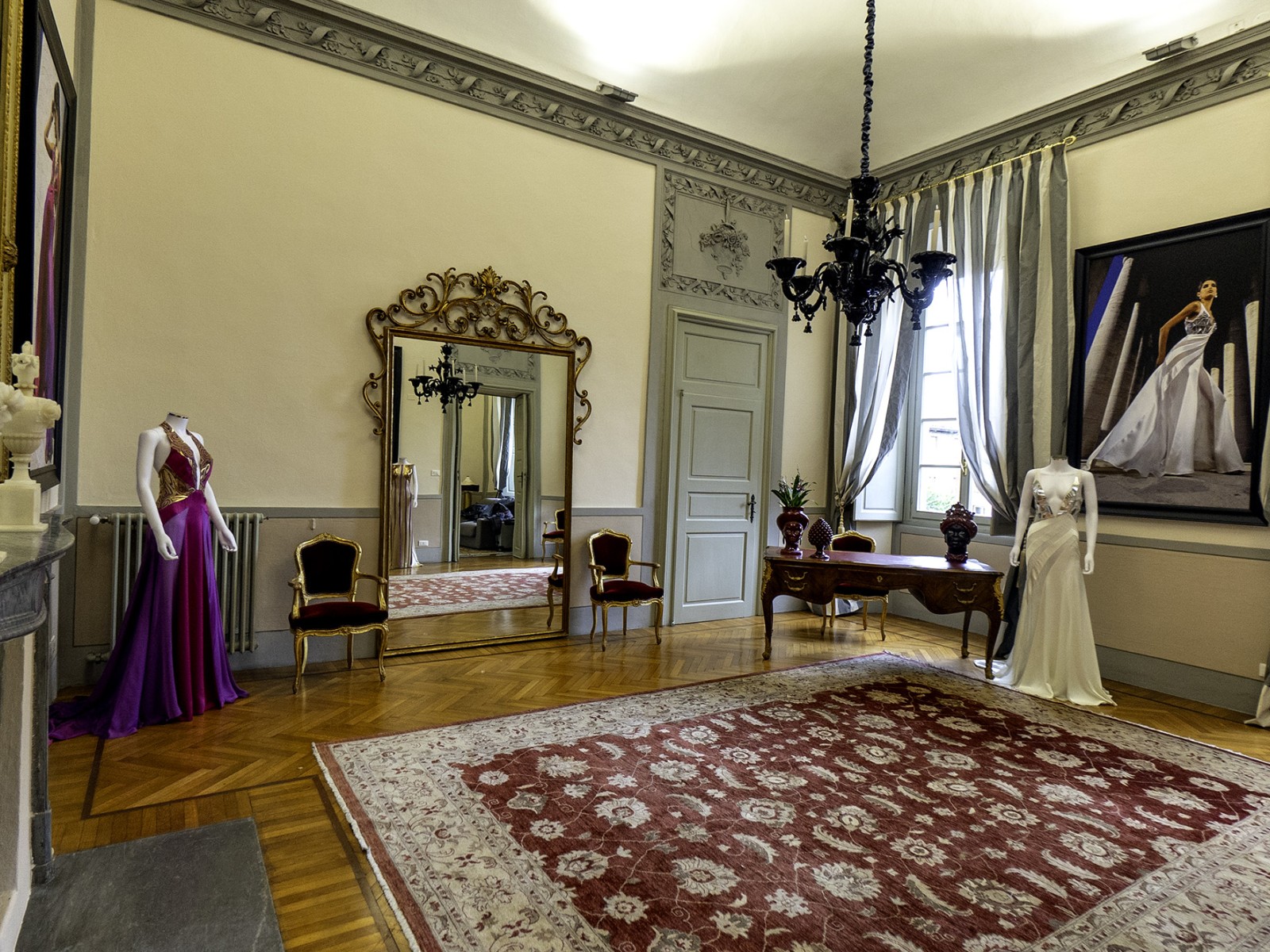 Siamo nel cuore di Piacenza, a due passi dal Duomo. E’ il palazzo Anguissola di Grazzano. Qui, oltre la facciata in cotto rosato si intravedono cortili, colonnati, stucchi e balconcini settecenteschi. Al piano nobile di questa meraviglia si trova l’atelier di Ettore Bilotta, il couturier romano che si è formato con Raffaella Curiel e Lancetti e ha poi creato le divise più eleganti per le più importanti compagnie aeree del mondo. Incantato dall’eleganza del palazzo piacentino ha deciso di stabilirsi a ottobre 2024. Così, per ApritiModa, tra affreschi e grandi specchi dorati, si scoprono gli abiti d’alta moda più belli delle sue collezioni, abiti da sposa e la sartoria dove prendono forma le sue creazioni.