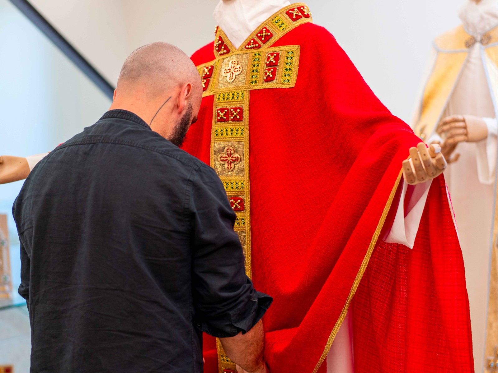 Il fascino per le vesti sacre conquista Filippo Sorcinelli quando è bambino e ogni sabato accompagna la mamma che tiene pulita la chiesa di Mondolfo, il borgo in provincia di Pesaro e Urbino dove è nato. La aspetta in sacrestia, e non si annoia. L’incenso lo inebria: diventerà un eccelso profumiere. L’organo a canne lo incanta: ne diventerà maestro. I paramenti lo chiamano, con i loro colori, i ricami, i messaggi che trasmettono. Nel 2000, a 25 anni, cuce la prima veste per un amico che diventa sacerdote; nel 2001 apre LAVS. I tessuti pregiati, le preziose bordure che lui stesso disegna, la fattura impeccabile ne fanno un punto di riferimento per le diocesi in Italia e all’estero. Nel tempo, ricostruirà i paramenti di Celestino V e cucirà un abito per la Madonna del Carmine di Trastevere. Poi, una telefonata: l’Ufficio delle Celebrazioni Liturgiche del Sommo Pontefice lo convoca: Benedetto XVI vuole i suoi paramenti. Dopo Ratzinger verrà Francesco, e dopo Francesco Leone XIV, con il quale la collaborazione inizia dalla prima celebrazione nella Cappella Sistina. Nell’atelier di Santarcangelo, dove Sorcinelli lavora con 12 collaboratori, si potrà visitare la sartoria vedendo all’opera gli artigiani; tutto quello che la loro abilità produce (paramenti ma anche suppellettili e accessori per la liturgia cattolica) potrà poi essere ammirato nello showroom. E infine saranno svelati due segreti: come è possibile che le vesti sacre indossate dai pontefici siano qui e contemporaneamente in Vaticano, e come si realizza un abito su misura per un Papa senza girargli intorno con metro e spilli.
