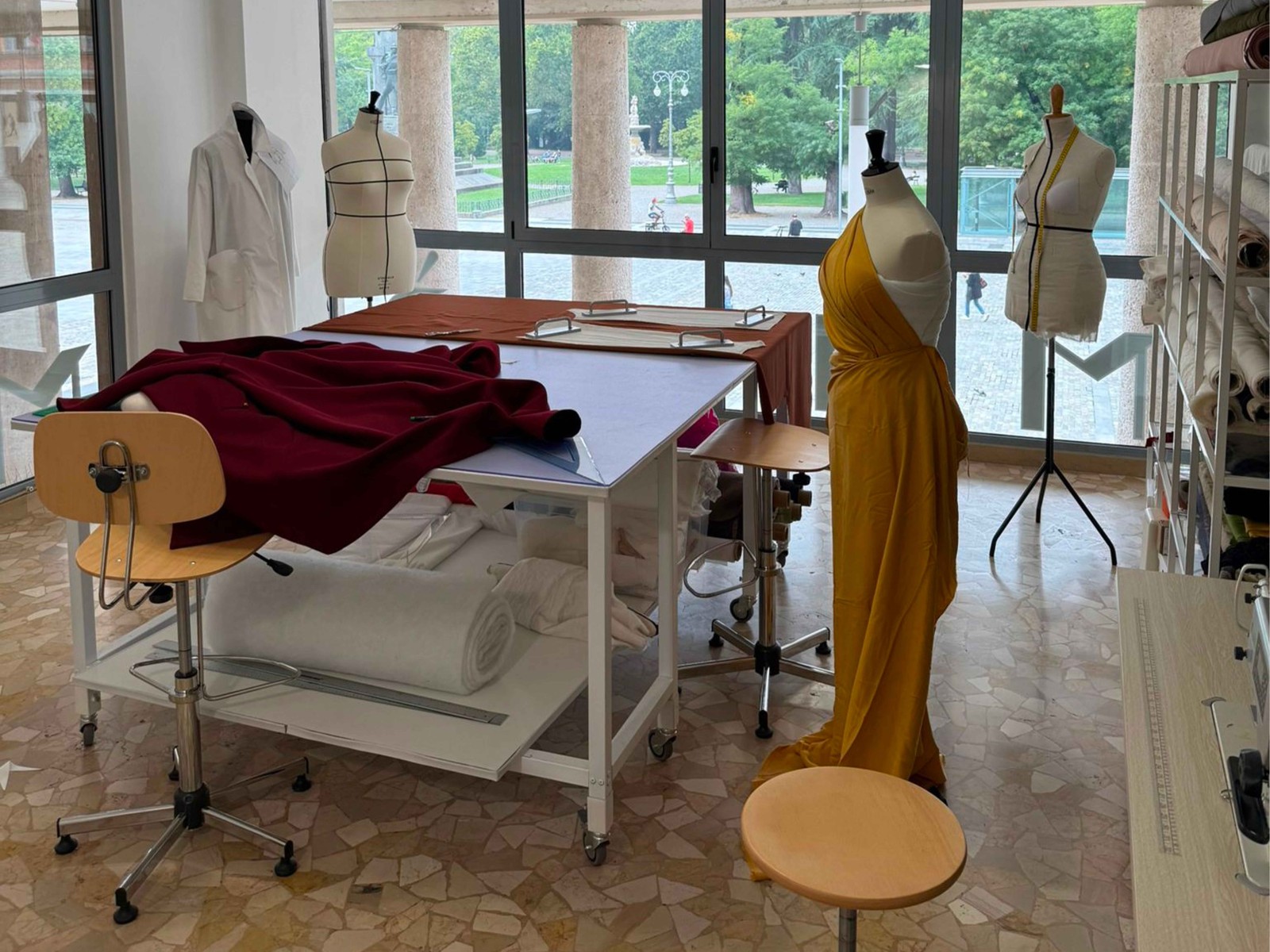 Tutto si mostra già dalla piazza: alzando lo sguardo, oltre le vetrate al primo piano si vedono i tessuti, i manichini, le mani che lavorano con ago, filo e forbici. Giuseppe Mileto il suo spazio lo sognava così, aperto agli occhi di tutti; e così, nel cuore di Reggio Emilia a un passo dai teatri che tanto ama, lo ha trovato. Matite, colori e bozzetti accolgono chi entra nell’atelier; nel salone si svela una sartoria dalla visione contemporanea e dai gesti antichi. I capi Milò sono l’essenza dell’artigianato: Giuseppe li presenta, assieme ai manichini che lui stesso modella con supporti e imbottiture sulle misure esatte del cliente. Ogni forma è unica, e addosso a quella forma l’abito viene tagliato e prende forma secondo l’ormai rarissima tecnica del moulage. Nelle mani di Giuseppe la stoffa si fa magia: vedrete come un metro e mezzo di seta, lavorato solo con le dita e un ferro da stiro, si trasforma in venti centimetri di tessuto plissettato. Sembra incredibile: Milò apre le sue porte per mostrarci che invece è vero.