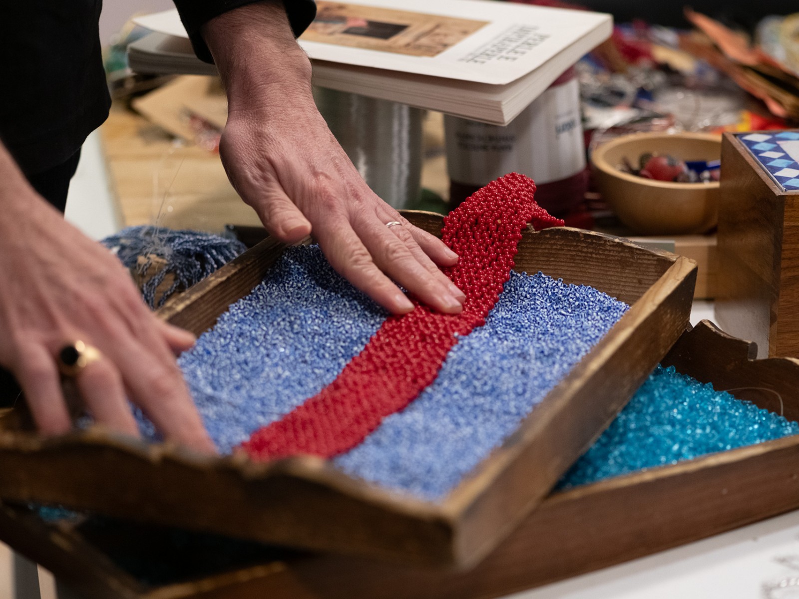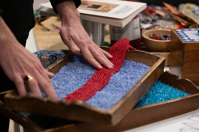 Nella città sull’acqua, a due passi dal Ponte di Rialto a Venezia, si trova l’atelier e il laboratorio dei fratelli Attombri. Da oltre trentasei anni realizzano gioielli-scultura lavorando le conterie, le perle di vetro di Murano, intrecciandole a mano. Vetro e metallo, gli elementi che compongono le loro creazioni, sono gli stessi materiali che ritornano nello spazio di San Polo. Qui, la luce entra dalle grandi vetrate e riflette i colori delle perle, rendendole ancora più preziose, mentre nel laboratorio al secondo piano, si continua a creare la bellezza di un sapere antico.