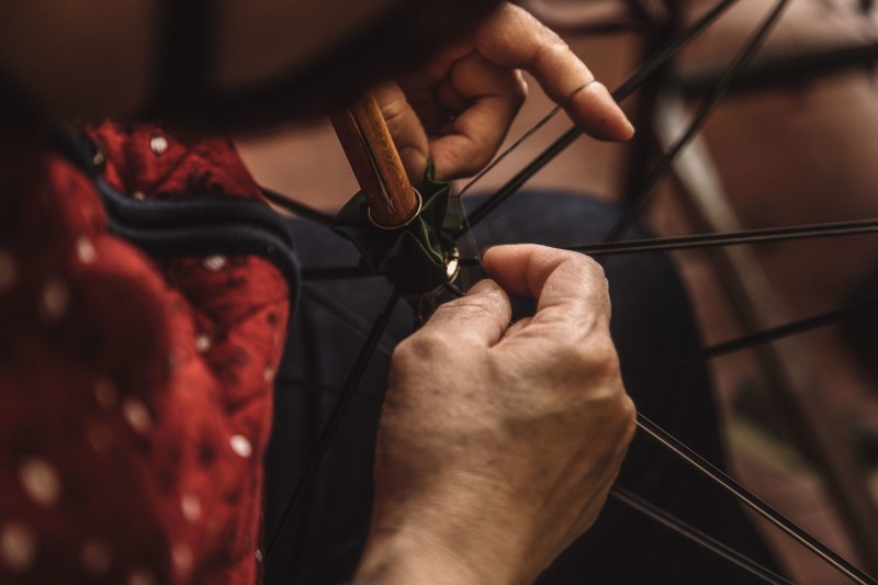 Teodorica e altre tre signore si occupano delle cuciture a mano, dell’orditura e dei ricami. Prima dello stiro, ogni millimetro di stoffa viene controllato attraverso la specula. Poi si passa al controllo della scorrevolezza delle parti meccaniche, il dettaglio del puntale, l’ovaletto con l’indirizzo, il numero di telefono, la firma del futuro proprietario.